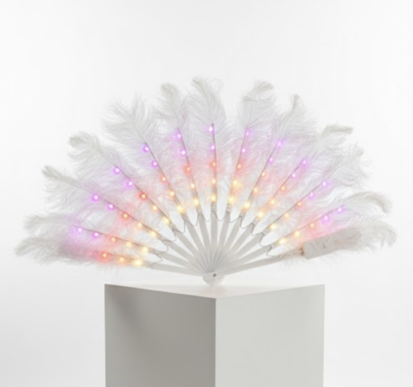 Light-up rave fan designed with fluffy white feathers and built-in multicoloir LED lights, perfect for festivals, performances, and nightlife fashion. This dramatic, handheld folding fan is ideal for drag shows, cosplay, dancers, and high-energy looks that demand attention. Lightweight and visually striking, it combines feather glamour with modern tech, creating a mesmerising effect under club lights or on stage. Whether you’re styling for a photoshoot, rave outfit, or dramatic entrance, this glowing feather fan is a must-have for bold self-expression.